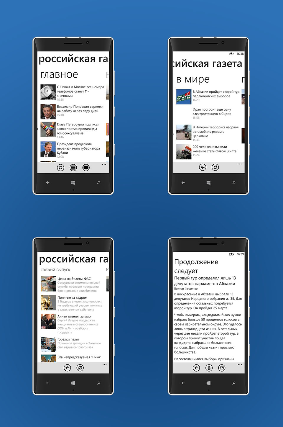 The mobile application for Rossiyskaya Gazeta is the Windows Phone mobile client of the periodical. The application provides easy access to all materials of the periodical. News and publications are structured under headings.