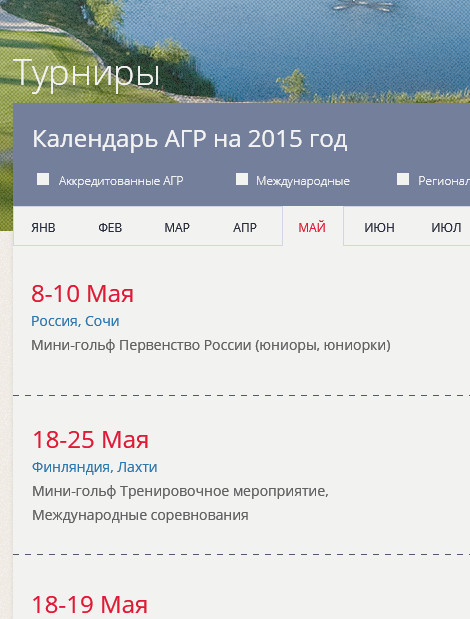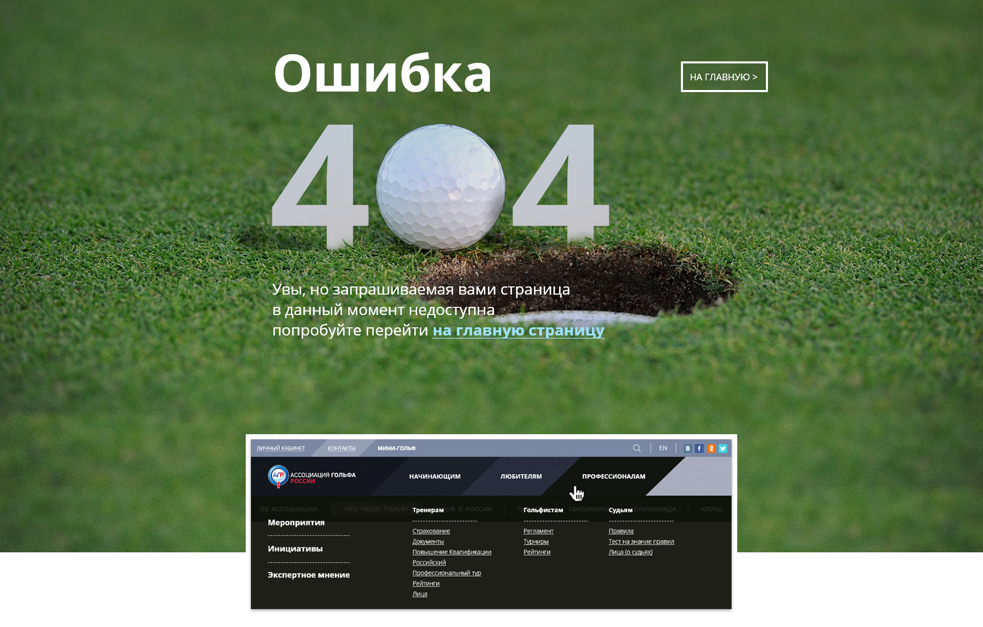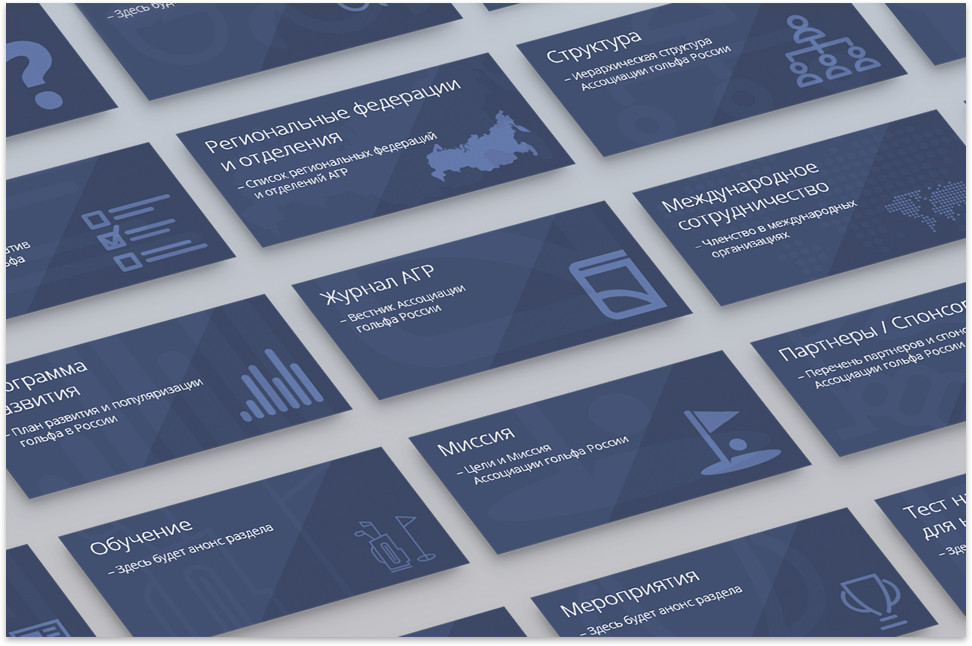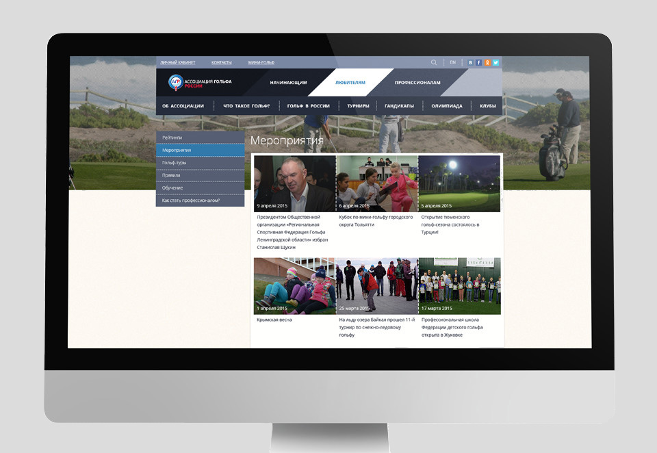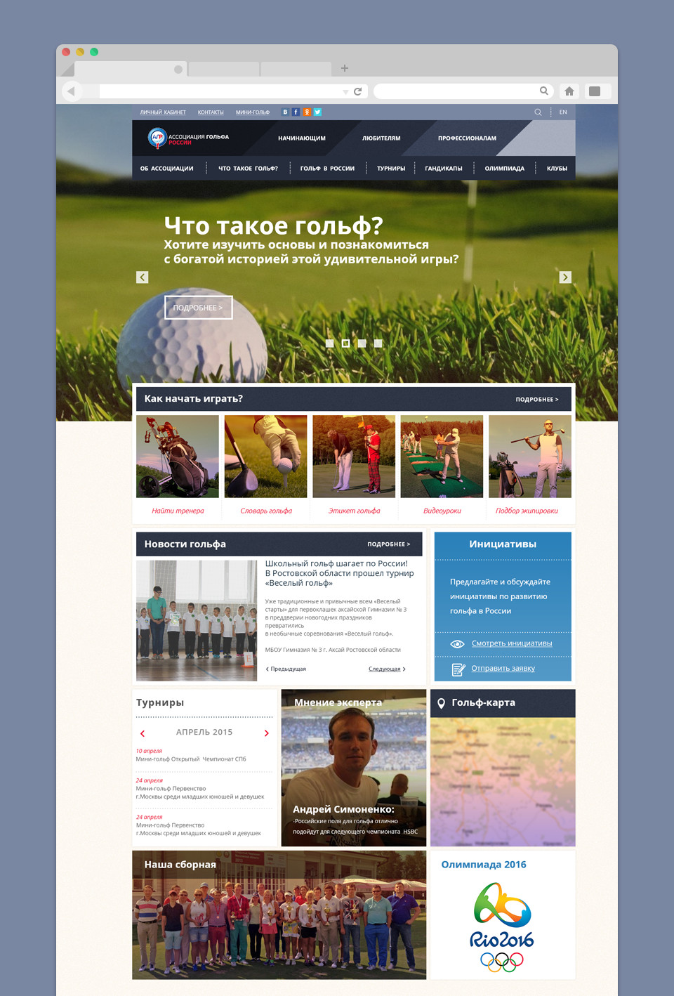 The new website of the Russian Golf Association was created for a wider audience with several target groups: professionals, amateurs, and beginners who have just started to go in for this sport. The website navigation model uses the same principle - apart from the main menu, the website features the information gate containing sections for each of these groups.