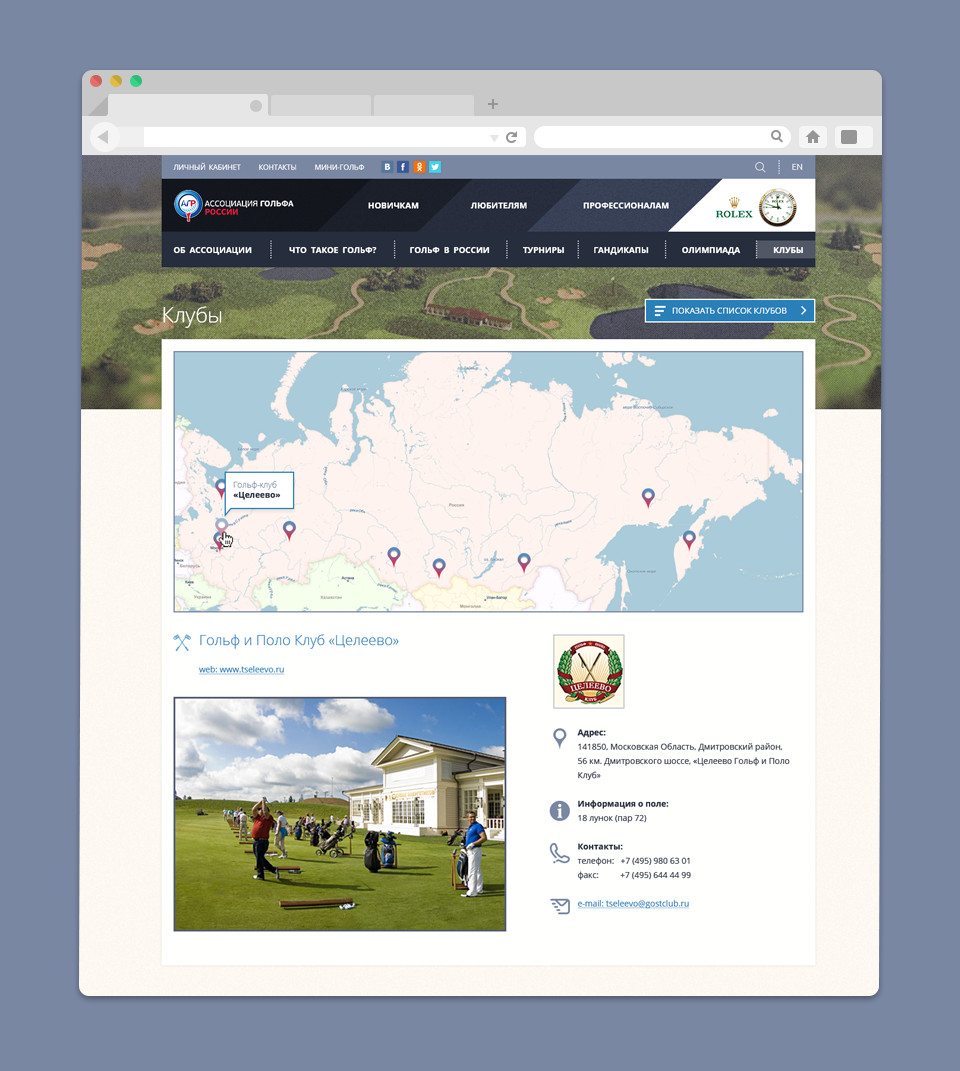 Since this already Olympic sport just begins its development in Russia, the website has a promo section “What is golf”, where one can find basic information on the history of the sport, its rules and ethics, persons, necessary outfit and terms, which you can meet in the game.
