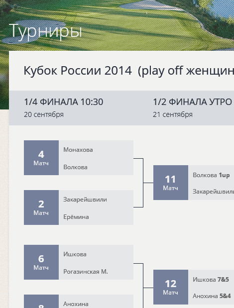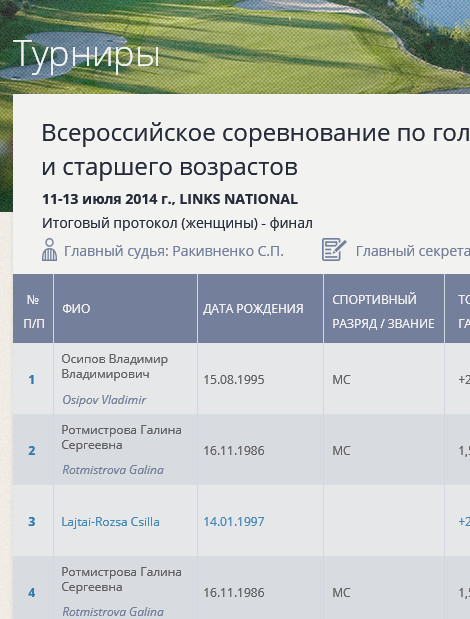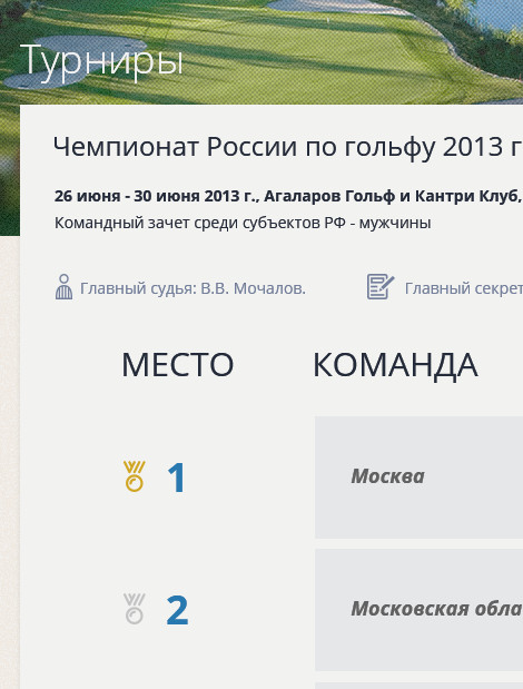 Apart from the official information on the Russian Golf Association (charter, structure, regional subdivision, initiatives, development program and other documents), the resource contains relevant information on all tournaments and other sports events, golf players handicaps, existing golf fields and clubs.